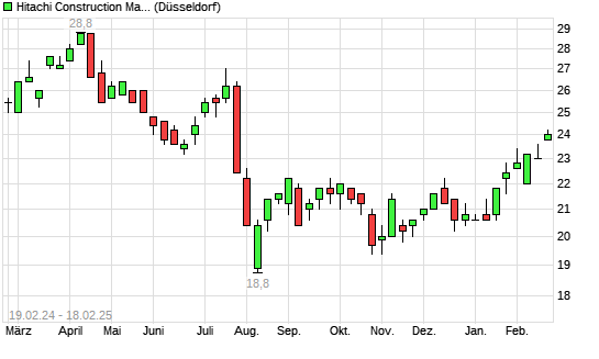 Mit dem Anstieg auf 24,00 EUR hat die Hitachi Construction Machinery-Aktie (ISIN JP3787000003) am 17.02.2025 ein neues 6-Monats-Hoch erreicht und damit den Kurs vom 10.02.2025 eingestellt.