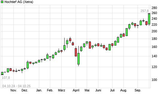 Mit dem Anstieg auf 255,00 EUR hat die Hochtief-Aktie (ISIN DE0006070006) am 03.10.2025 ein neues All-Time-High erreicht und damit den Kurs vom 02.10.2025 eingestellt.