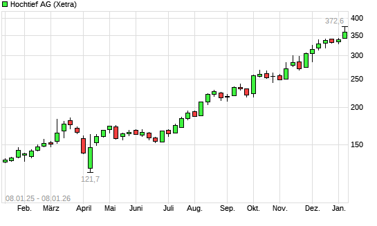 Mit dem Anstieg auf 372,00 EUR hat die Hochtief-Aktie (ISIN DE0006070006) am 07.01.2026 ein neues All-Time-High erreicht und damit den Kurs vom 06.01.2026 eingestellt.