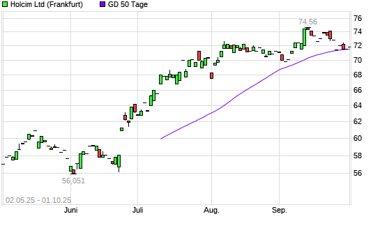 Mit dem Rücksetzer auf 71,50 EUR hat die Holcim-Aktie am 30.09.2025 die 50-Tage-Linie nach unten gekreuzt.