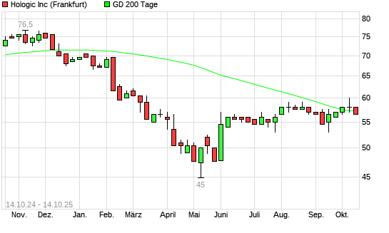 Mit dem Rücksetzer auf 56,50 EUR hat die Hologic-Aktie am 13.10.2025 die 200-Tage-Linie nach unten gekreuzt.
