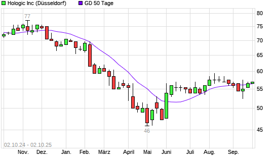 Mit dem Rücksetzer auf 56,50 EUR hat die Hologic-Aktie am 01.10.2025 die 50-Tage-Linie nach unten gekreuzt.