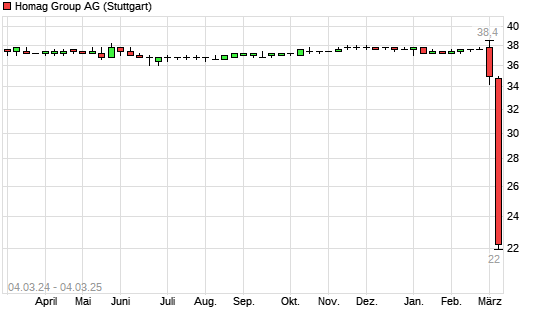 Mit dem Rücksetzer auf 34,00 EUR hat die Homag-Aktie (ISIN DE0005297204) am 03.03.2025 ein neues 3-Jahres-Tief erreicht und damit den Kurs vom 16.10.2023 eingestellt.
