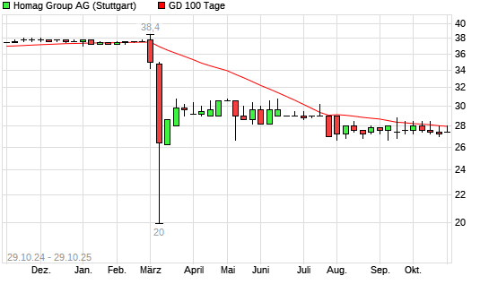 Mit dem Rücksetzer auf 27,20 EUR hat die Homag-Aktie am 28.10.2025 die 100-Tage-Linie nach unten gekreuzt.Die Homag-Aktie befindet sich seit dem 03.03.2025 im langfristigen Abwärtstrend ...weiterlesen