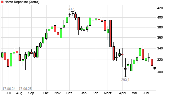 Mit dem Rücksetzer auf 304,20 EUR hat die Home Depot-Aktie (ISIN US4370761029) am 16.06.2025 ein neues 12-Monats-Tief erreicht und damit den Kurs vom 11.04.2025 eingestellt.