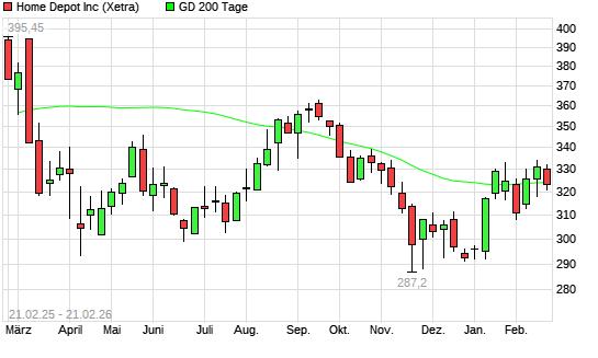 Mit dem Anstieg auf 323,85 EUR hat die Home Depot-Aktie am 20.02.2026 die 200-Tage-Linie nach oben gekreuzt.