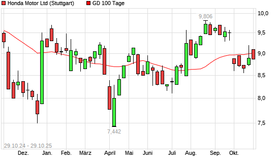 Mit dem Anstieg auf 9,11 EUR hat die Honda Motor-Aktie am 28.10.2025 die 100-Tage-Linie nach oben gekreuzt.