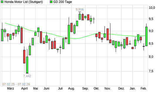 Mit dem Anstieg auf 9,00 EUR hat die Honda Motor-Aktie am 06.02.2026 die 200-Tage-Linie nach oben gekreuzt.