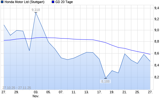 Mit dem Rücksetzer auf 8,55 EUR hat die Honda Motor-Aktie am 26.11.2025 die 20-Tage-Linie nach unten gekreuzt.