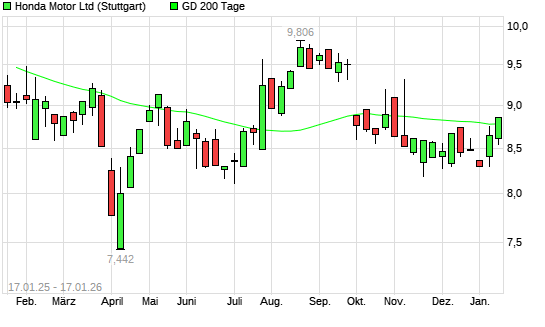 Mit dem Rücksetzer auf 8,81 EUR hat die Honda Motor-Aktie am 16.01.2026 die 200-Tage-Linie nach unten gekreuzt.