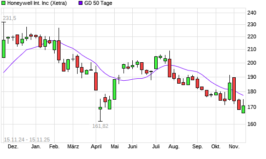 Mit dem Rücksetzer auf 168,58 EUR hat die Honeywell-Aktie am 14.11.2025 die 50-Tage-Linie nach unten gekreuzt.