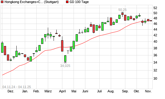 Mit dem Anstieg auf 47,46 EUR hat die Hongkong Exchanges+Clearing-Aktie am 03.11.2025 die 100-Tage-Linie nach oben gekreuzt.