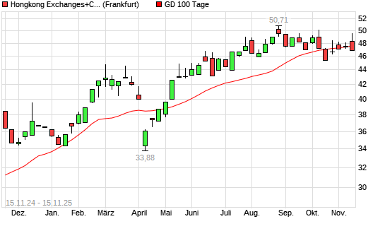 Mit dem Rücksetzer auf 46,90 EUR hat die Hongkong Exchanges+Clearing-Aktie am 14.11.2025 die 100-Tage-Linie nach unten gekreuzt.Die Hongkong Exchanges+Clearing-Aktie befindet sich seit ...weiterlesen