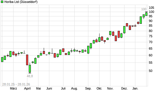 Mit dem Anstieg auf 100,00 EUR hat die Horiba-Aktie (ISIN JP3853000002) am 27.01.2026 ein neues All-Time-High erreicht und damit den Kurs vom 22.03.2024 eingestellt.