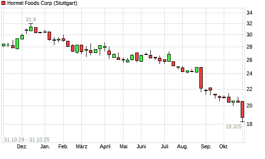 Mit dem Rücksetzer auf 18,48 EUR hat die Hormel Foods-Aktie (ISIN US4404521001) am 30.10.2025 ein neues 10-Jahres-Tief erreicht und damit den Kurs vom 29.10.2025 eingestellt.