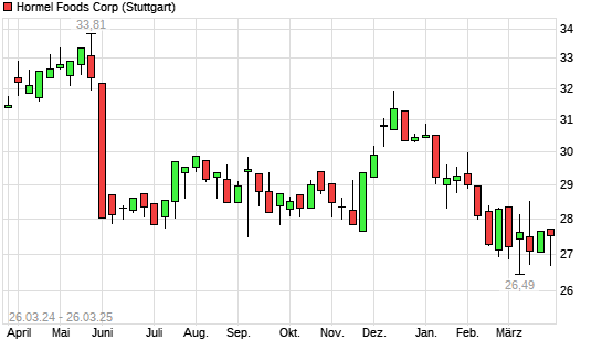 Mit dem Rücksetzer auf 26,49 EUR hat die Hormel Foods-Aktie (ISIN US4404521001) am 25.03.2025 ein neues 5-Jahres-Tief erreicht und damit den Kurs vom 06.03.2025 eingestellt.