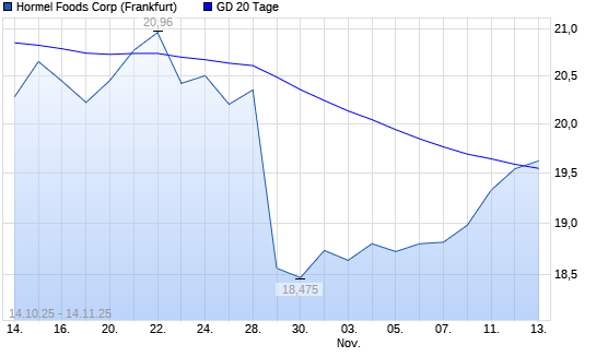 Mit dem Anstieg auf 19,62 EUR hat die Hormel Foods-Aktie am 13.11.2025 die 20-Tage-Linie nach oben gekreuzt.