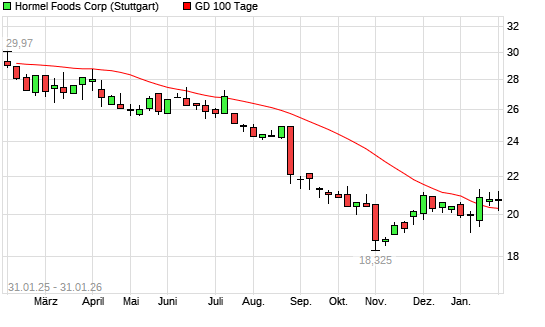 Mit dem Rücksetzer auf 20,20 EUR hat die Hormel Foods-Aktie am 30.01.2026 die 100-Tage-Linie nach unten gekreuzt.