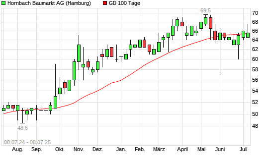 Mit dem Rücksetzer auf 65,50 EUR hat die Hornbach Baumarkt-Aktie am 07.07.2025 die 100-Tage-Linie nach unten gekreuzt.