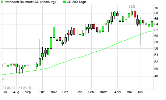 Mit dem Rücksetzer auf 62,00 EUR hat die Hornbach Baumarkt-Aktie am 23.06.2025 die 200-Tage-Linie nach unten gekreuzt.