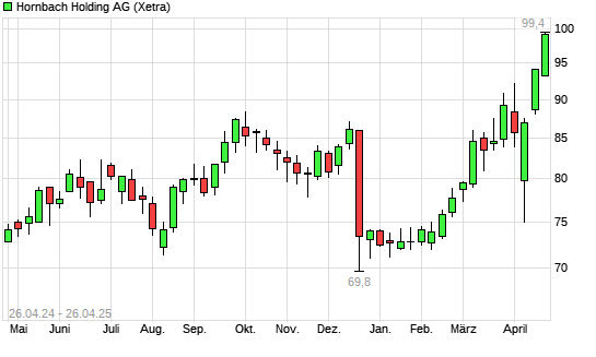 Mit dem Anstieg auf 98,70 EUR hat die Hornbach Holding-Aktie (ISIN DE0006083405) am 25.04.2025 ein neues 12-Monats-Hoch erreicht und damit den Kurs vom 24.04.2025 eingestellt.