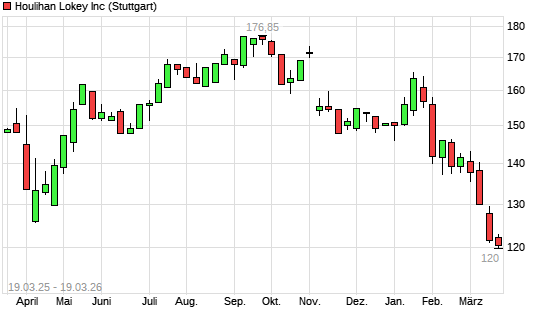 Mit dem Rücksetzer auf 120,55 EUR hat die Houlihan Lokey-Aktie (ISIN US4415931009) am 18.03.2026 ein neues 12-Monats-Tief erreicht und damit den Kurs vom 12.03.2026 eingestellt.