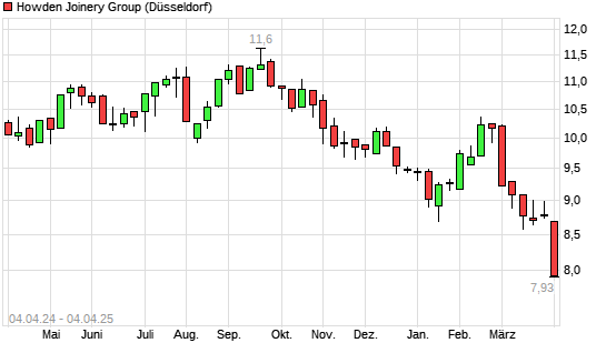 Mit dem Rücksetzer auf 8,44 EUR hat die Howden Joinery Group-Aktie (ISIN GB0005576813) am 03.04.2025 ein neues 12-Monats-Tief erreicht und damit den Kurs vom 02.04.2025 eingestellt.
