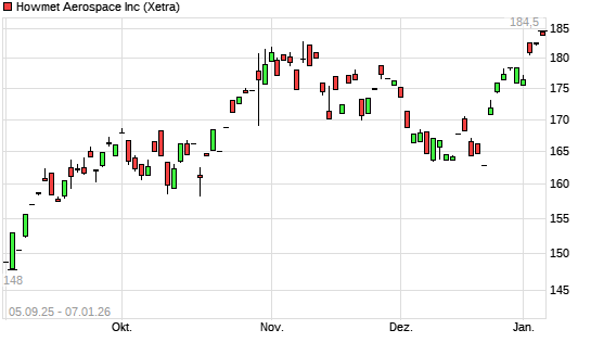 Mit dem Anstieg auf 183,40 EUR hat die Howmet Aerospace-Aktie (ISIN US4432011082) am 06.01.2026 ein neues All-Time-High erreicht und damit den Kurs vom 10.11.2025 eingestellt.