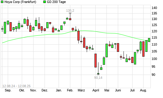 Mit dem Rücksetzer auf 111,80 EUR hat die Hoya-Aktie am 11.08.2025 die 200-Tage-Linie nach unten gekreuzt.