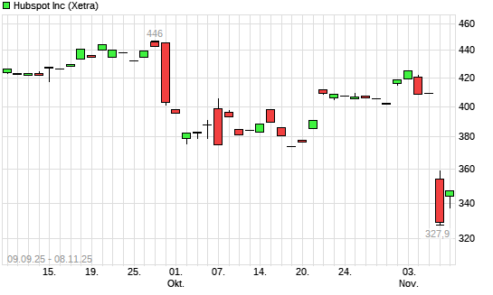 Mit dem Rücksetzer auf 341,40 EUR hat die HubSpot-Aktie (ISIN US4435731009) am 07.11.2025 ein neues 12-Monats-Tief erreicht und damit den Kurs vom 06.11.2025 eingestellt.