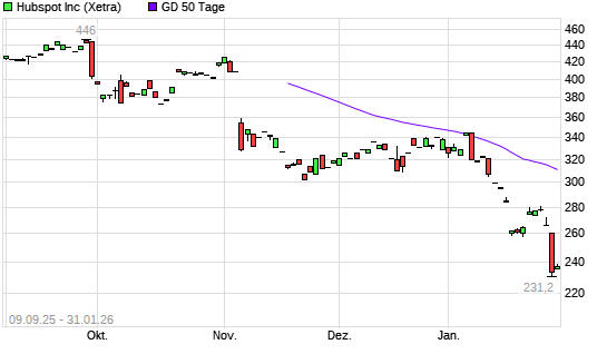 Mit dem Rücksetzer auf 231,80 EUR hat die HubSpot-Aktie am 30.01.2026 die 50-Tage-Linie nach unten gekreuzt.