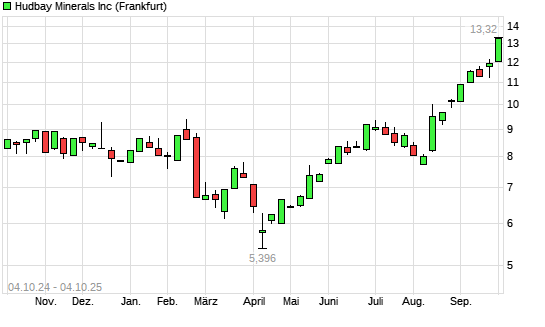 Mit dem Anstieg auf 13,32 EUR hat die Hudbay Minerals-Aktie (ISIN CA4436281022) am 03.10.2025 ein neues 10-Jahres-Hoch erreicht und damit den Kurs vom 02.10.2025 eingestellt.