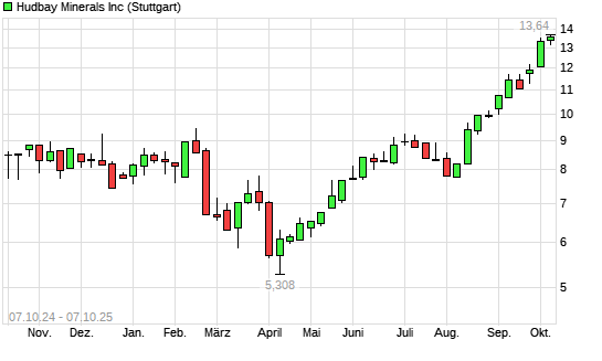 Mit dem Anstieg auf 13,34 EUR hat die Hudbay Minerals-Aktie (ISIN CA4436281022) am 06.10.2025 ein neues 10-Jahres-Hoch erreicht und damit den Kurs vom 03.10.2025 eingestellt.