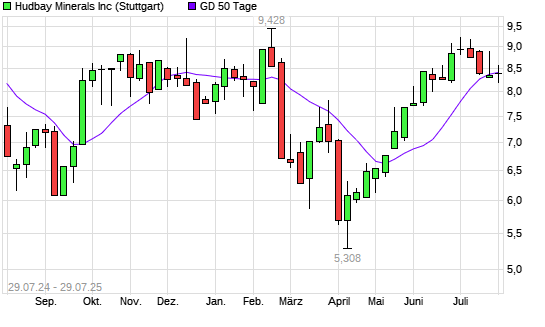 Mit dem Rücksetzer auf 8,22 EUR hat die Hudbay Minerals-Aktie am 28.07.2025 die 50-Tage-Linie nach unten gekreuzt.
