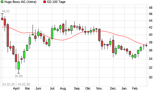 Mit dem Anstieg auf 37,34 EUR hat die Hugo Boss-Aktie am 23.02.2026 die 100-Tage-Linie nach oben gekreuzt.