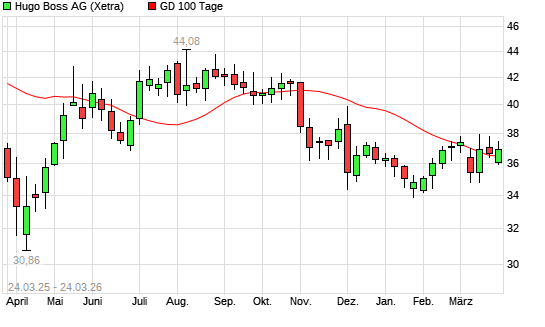 Mit dem Rücksetzer auf 35,88 EUR hat die Hugo Boss-Aktie am 23.03.2026 die 100-Tage-Linie nach unten gekreuzt.