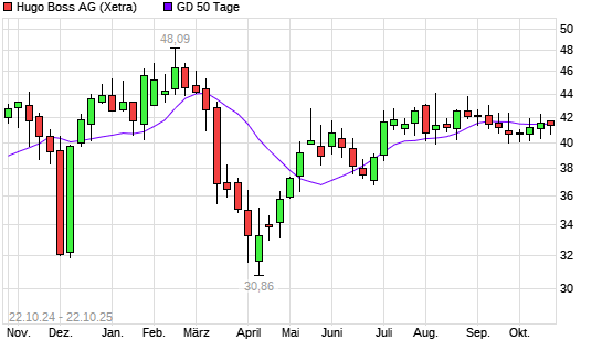 Mit dem Anstieg auf 41,55 EUR hat die Hugo Boss-Aktie am 21.10.2025 die 50-Tage-Linie nach oben gekreuzt.Die Hugo Boss-Aktie befindet sich seit dem 08.10.2025 im langfristigen Aufwärtstrend ...weiterlesen