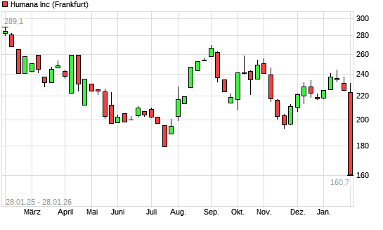 Mit dem Rücksetzer auf 172,20 EUR hat die Humana-Aktie (ISIN US4448591028) am 27.01.2026 ein neues 5-Jahres-Tief erreicht und damit den Kurs vom 18.07.2025 eingestellt.