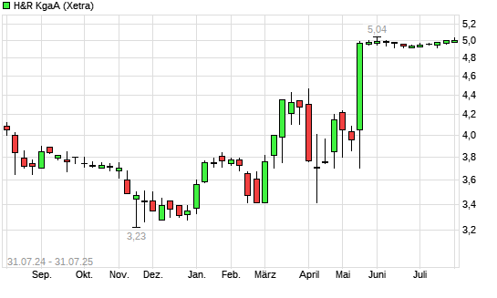 Mit dem Anstieg auf 5,02 EUR hat die H&R-Aktie (ISIN DE000A2E4T77) am 30.07.2025 ein neues 12-Monats-Hoch erreicht und damit den Kurs vom 22.05.2025 eingestellt.