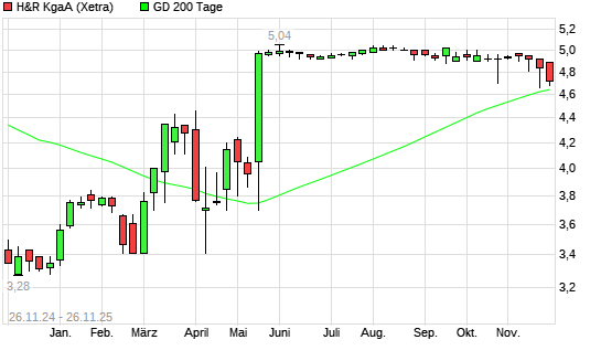 Mit dem Rücksetzer auf 4,18 EUR hat die H&R-Aktie am 25.11.2025 die 200-Tage-Linie nach unten gekreuzt.