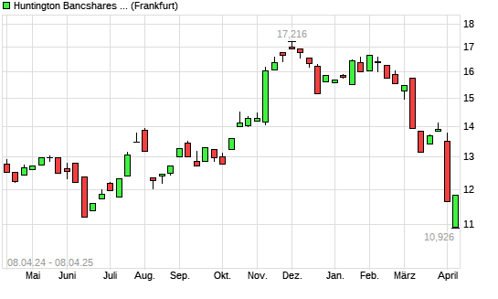 Mit dem Rücksetzer auf 10,93 EUR hat die Huntington Bancshares-Aktie (ISIN US4461501045) am 07.04.2025 ein neues 12-Monats-Tief erreicht und damit den Kurs vom 14.06.2024 eingestellt.