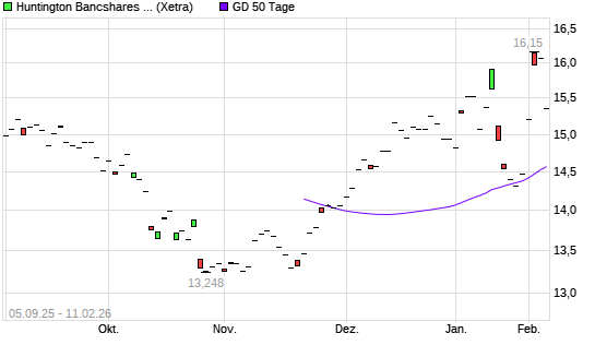 Mit dem Rücksetzer auf 14,52 EUR hat die Huntington Bancshares-Aktie am 13.02.2026 die 50-Tage-Linie nach unten gekreuzt.