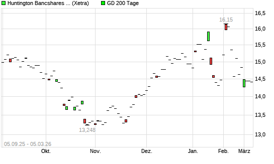 Mit dem Anstieg auf 14,50 EUR hat die Huntington Bancshares-Aktie am 06.03.2026 die 200-Tage-Linie nach oben gekreuzt.Die Huntington Bancshares-Aktie befand sich seit dem 02.03.2026 ...weiterlesen