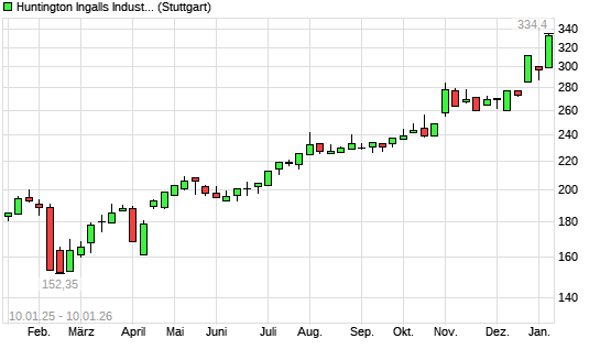 Mit dem Anstieg auf 332,70 EUR hat die Huntington Ingalls-Aktie (ISIN US4464131063) am 09.01.2026 ein neues All-Time-High erreicht und damit den Kurs vom 08.01.2026 eingestellt.