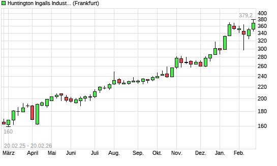 Mit dem Anstieg auf 374,50 EUR hat die Huntington Ingalls-Aktie (ISIN US4464131063) am 19.02.2026 ein neues All-Time-High erreicht und damit den Kurs vom 16.01.2026 eingestellt.