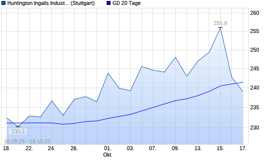 Mit dem Rücksetzer auf 238,70 EUR hat die Huntington Ingalls-Aktie am 17.10.2025 die 20-Tage-Linie nach unten gekreuzt.
