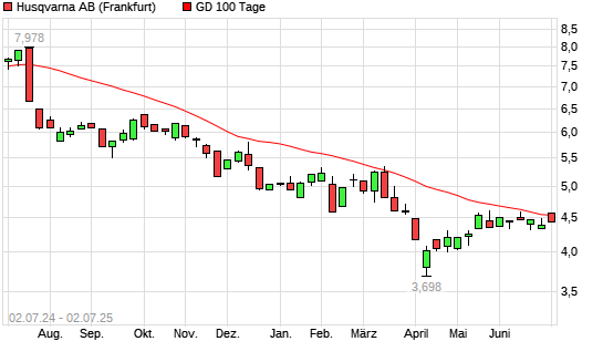 Mit dem Rücksetzer auf 4,44 EUR hat die Husqvarna-Aktie am 01.07.2025 die 100-Tage-Linie nach unten gekreuzt.