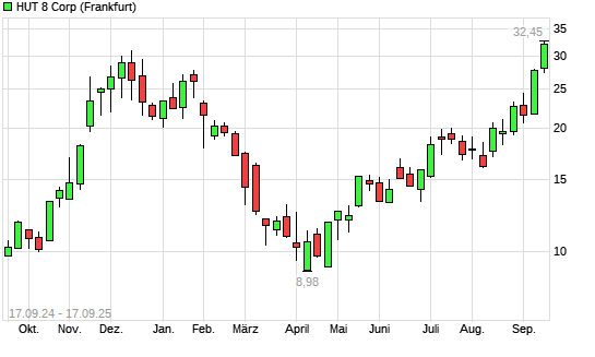 Mit dem Anstieg auf 29,40 EUR hat die Hut 8 Mining-Aktie (ISIN US44812J1043) am 16.09.2025 ein neues 3-Jahres-Hoch erreicht und damit den Kurs vom 06.12.2024 eingestellt.