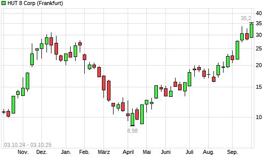 Mit dem Anstieg auf 33,50 EUR hat die Hut 8 Mining-Aktie (ISIN US44812J1043) am 02.10.2025 ein neues 3-Jahres-Hoch erreicht und damit den Kurs vom 18.09.2025 eingestellt.