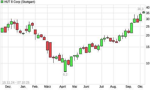 Mit dem Anstieg auf 35,70 EUR hat die Hut 8 Mining-Aktie (ISIN US44812J1043) am 06.10.2025 ein neues 3-Jahres-Hoch erreicht und damit den Kurs vom 03.10.2025 eingestellt.